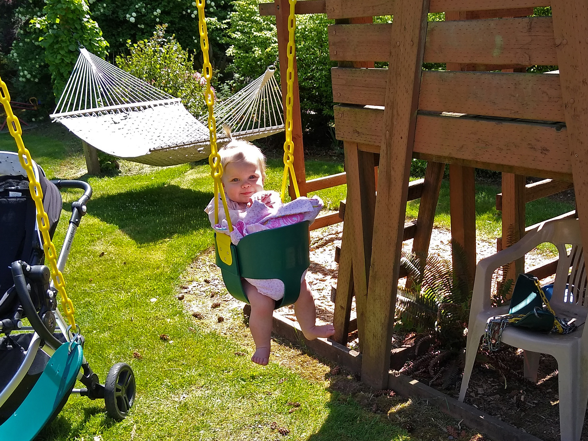 Vera and I were out looking at the flowers when Dianne came along with Josie in the stroller. She had gone up and got her from Laury. After we visited with her for a few minutes she headed over to the play fort where they had installed a new baby swing. I went back to watering the new lilacs when I saw the swing going and little feet kicking I went over to watch the action for a couple of minutes. She is actually swinging but the camera stopped the motion. She did a little talking and even a little raspberry so she was really enjoying it.